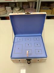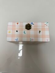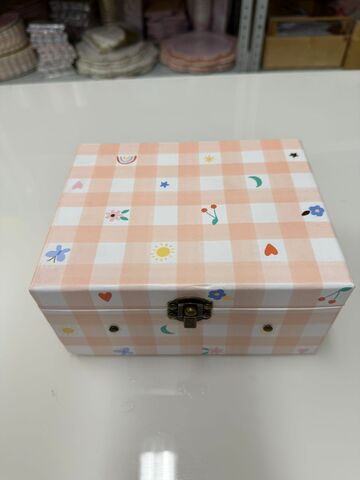 - Чемодан в розовую клетку изготовлен из толстого картона, имеет кожаную ручку и застежку из полированной латуни.