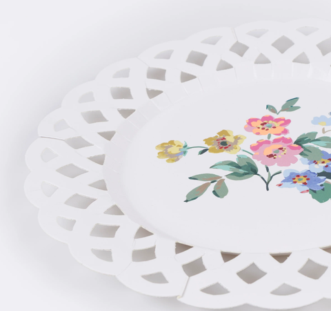 Эти элегантные бумажные сервировочные тарелки, вдохновленные винтажным текстилем, украшены изящной каймой с эффектом плетеной корзины и волнистым краем. В центре изображены нежные цветы, придающие тарелкам цветочный оттенок. Сочетая в себе классический стиль и свежий взгляд на вещи, они идеально подойдут для обедов в саду, послеобеденных чаепитий, торжественных ужинов или девичников, привнося непринужденное очарование и стиль в праздники для взрослых.