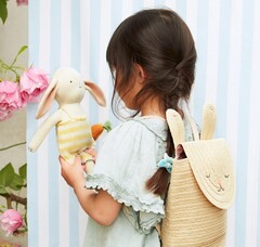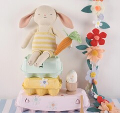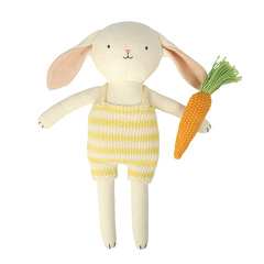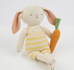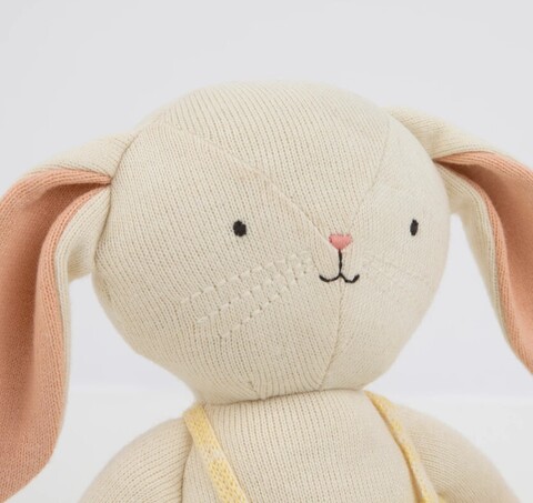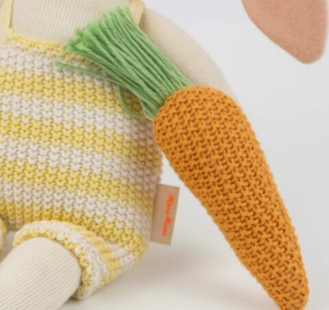 Встречайте зайчика Хани — качественную вязаную игрушку, выполненную из мягкого органического хлопка. Хани одета в очаровательный вязаный комбинезон и сжимает в руках связанную крючком морковку. Сказочный пасхальный подарок или игрушка для творческих игр, идеальный маленький друг для детей всех возрастов.