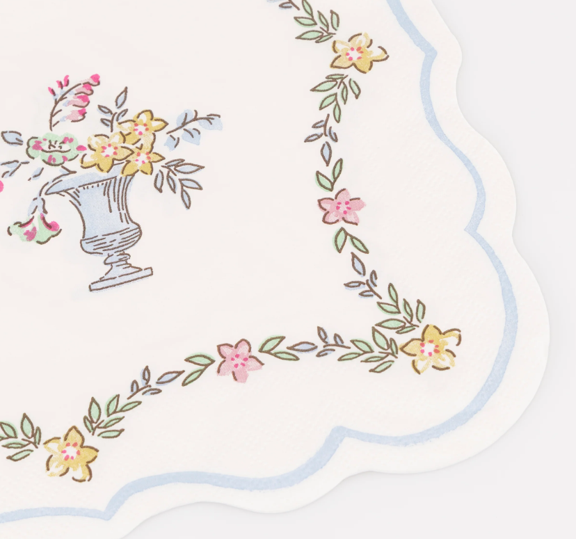 Эти стильные большие бумажные салфетки придадут элегантность и шарм любому столу. Они выполнены в стиле рококо и украшены цветочным узором в стиле ситца с декоративной вазой в центре. Мягкие волнистые края придают салфеткам изящный вид, напоминая о красоте винтажной керамики, но при этом выглядят свежо. Они идеально подойдут для обедов в саду, послеобеденных чаепитий или весенних ужинов и придадут торжественность взрослым посиделкам.