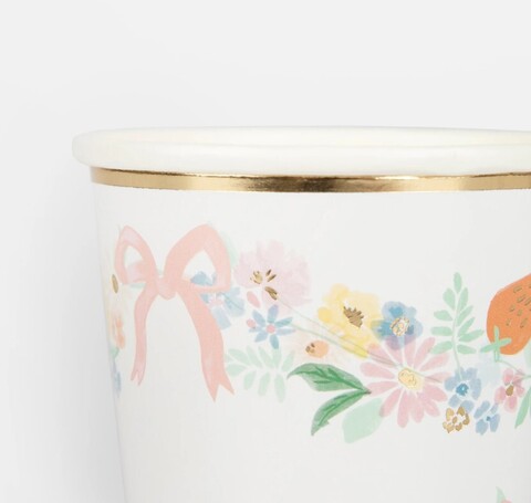Элегантное сочетание акварельных цветов, клубники и модных бантов на этих чашках для вечеринок идеально подходит для вечеринок в саду, свадебного торжества или любого праздника, где вам нужен изысканный эффект.