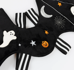 - На крыльях изображены луна и летучая мышь из блестящей серебристой искусственной кожи; привидение и череп из блестящей белой искусственной кожи; вышитые оранжевые тыква и звезды; вышитые серебристые звезды и паутина.