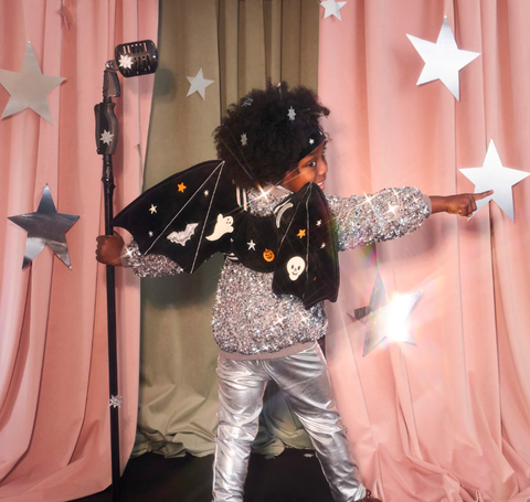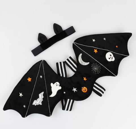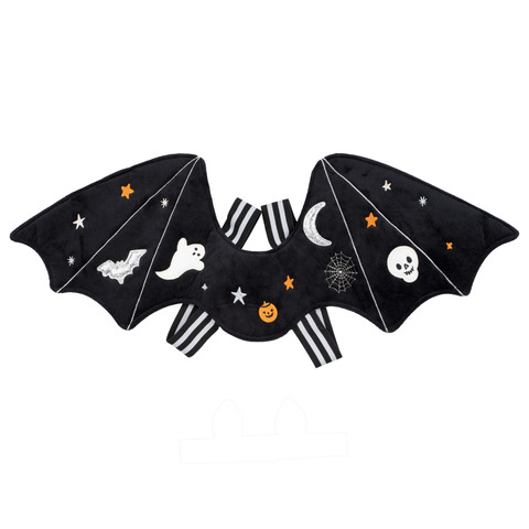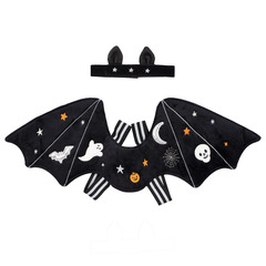 Пусть ваши дети полетают в этом очаровательном костюме летучей мыши. Мягкие бархатные крылья и игривое оголовье с ушками — идеальный штрих к жутко-милому образу. Идеально подходит для вечеринок на Хэллоуин, выпрашивания сладостей или переодеваний в любое время года. Гибкая проволока внутри крыльев позволяет придать им нужную форму, а блестящие детали из искусственной кожи и вышитые персонажи Хэллоуина добавят волшебного штриха.