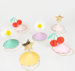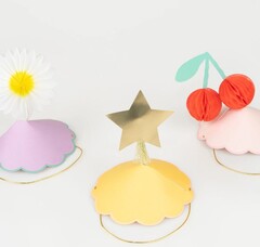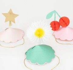 Забудьте о простых праздничных колпаках! Порадуйте своих гостей, подарив им эти потрясающие шляпы в стиле «чародей» с сотами и тканевыми украшениями из блесток. Дизайны ромашек, звезд и вишен несут в себе более чем отголосок 90-х. Веселые и забавные, они идеально подходят для фотографий на вечеринках.