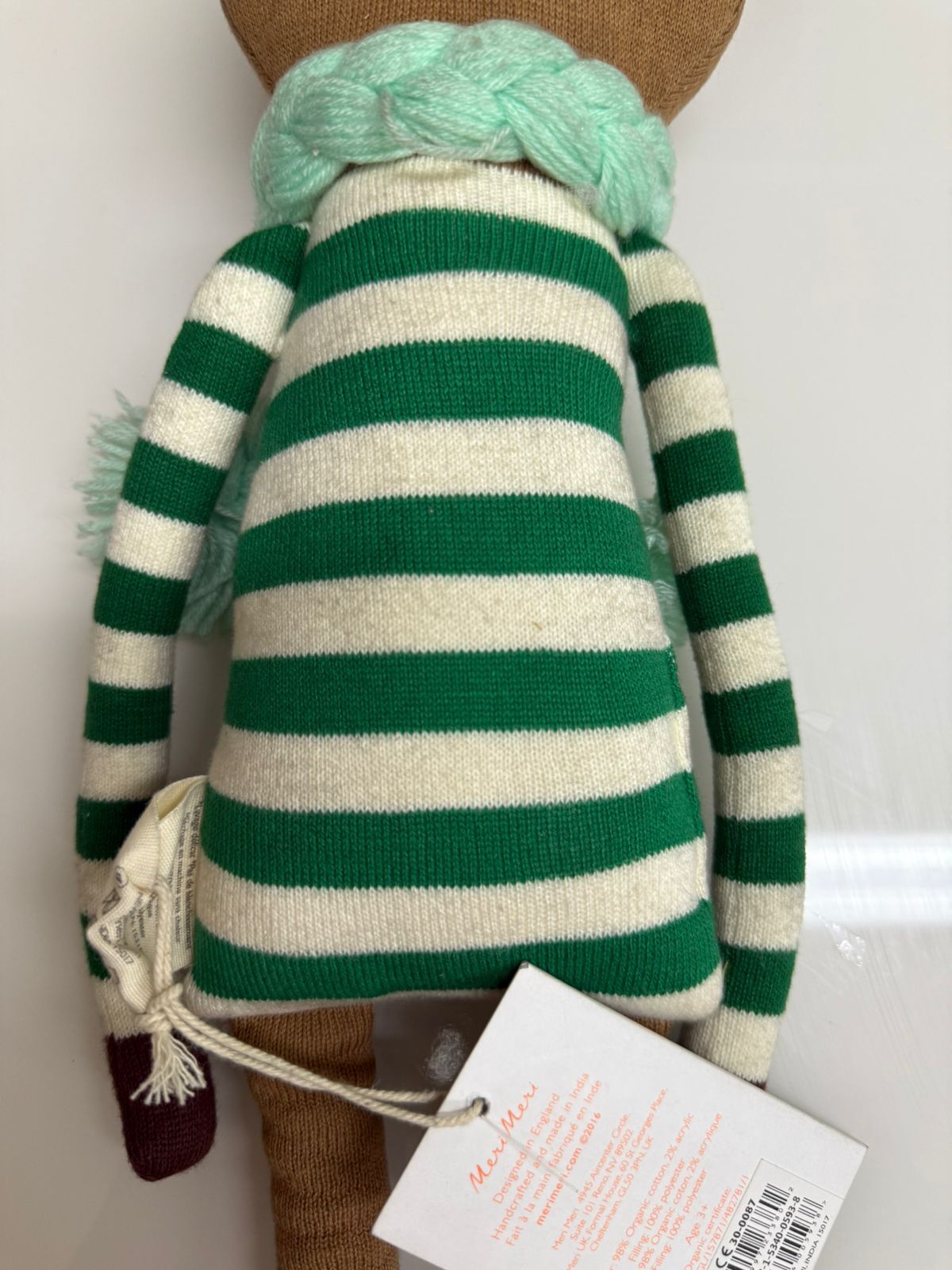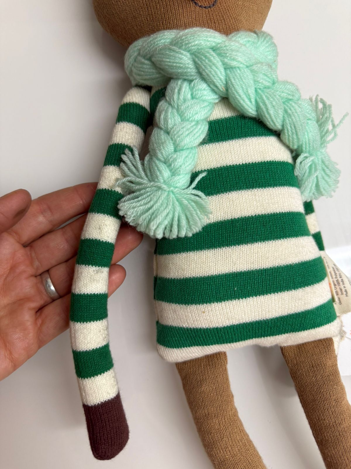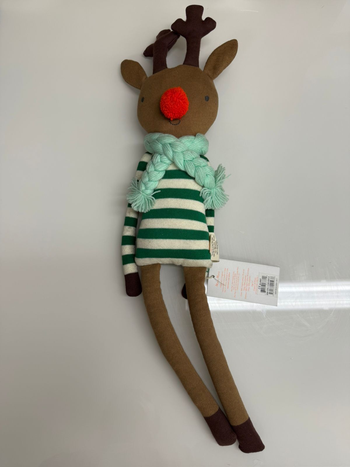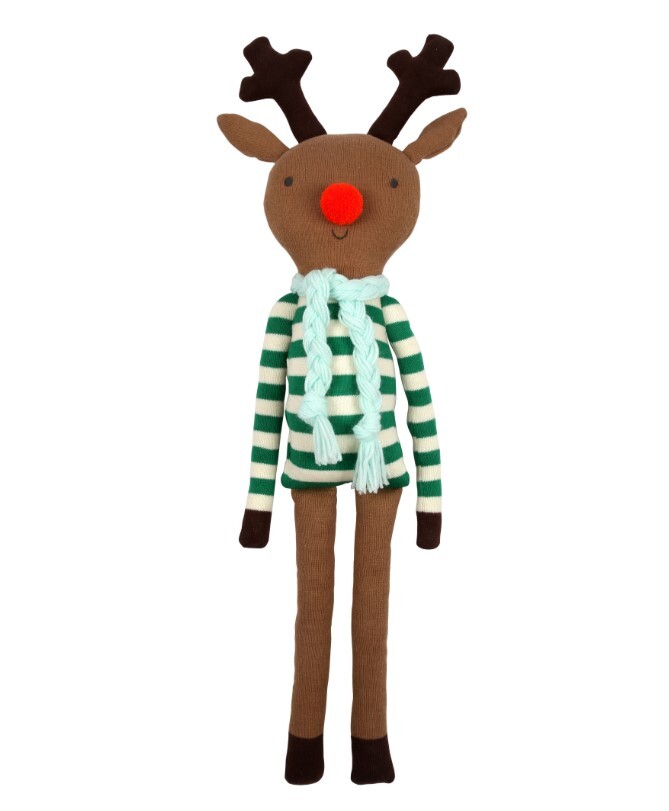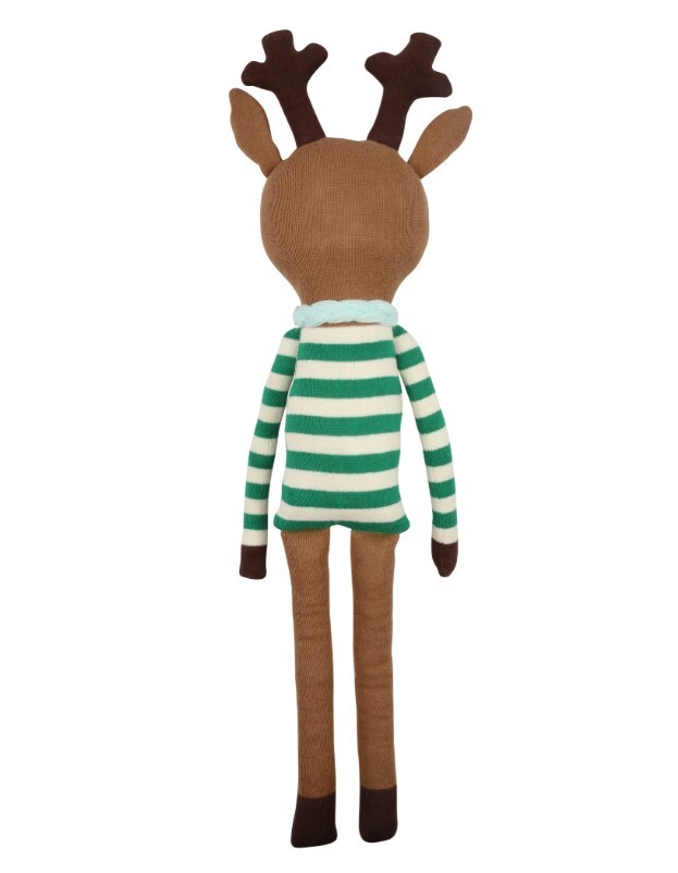 Олень Джинглс очарователен и идеально подходит для объятий. Изготовлен из мягкого трикотажного органического хлопка с милыми прострочками, рубиново-красным носиком с помпоном и шарфом из пряжи. Сказочный подарок на часы творческой игры в праздничный сезон и за его пределами.