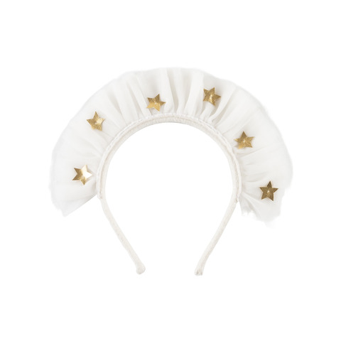 - Повязка на голову украшена оборкой из гофрированного белого тюля с прикрепленными золотыми звездами из искусственной кожи.