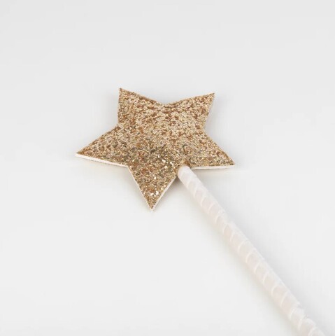 - Палочка украшена звездой из блестящей ткани с золотым блеском и бархатной лентой цвета слоновой кости, намотанной на деревянную ручку.