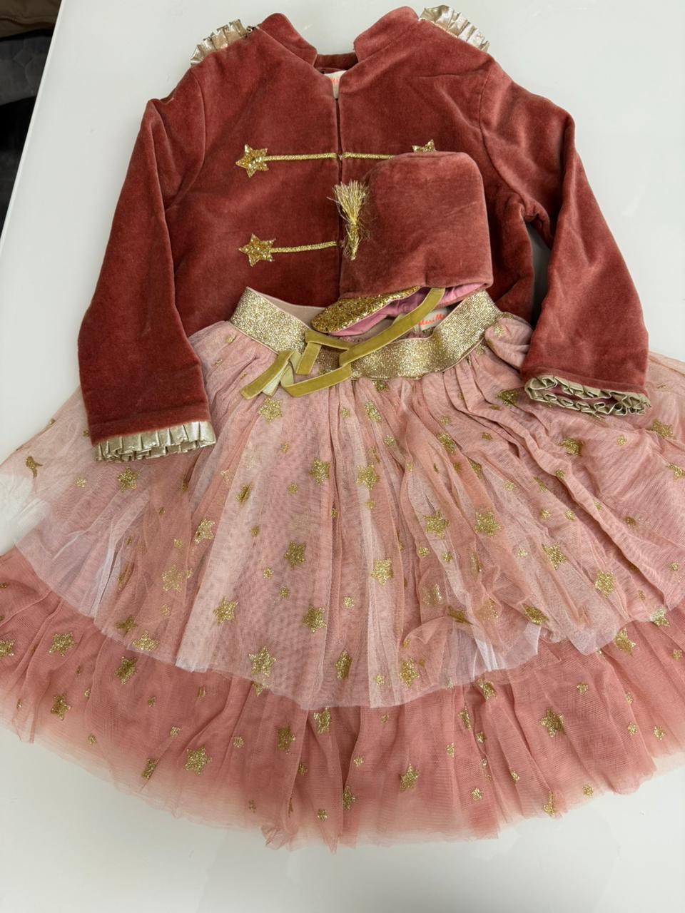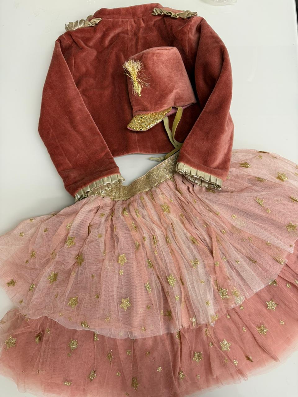 - Юбка-пачка из слоев розового тюля с золотым эластичным поясом и золотыми блестящими звездочками.