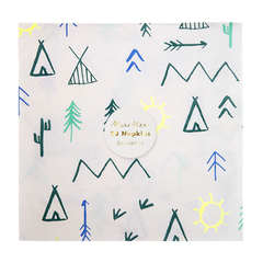 Организовываете вечеринку для любителя приключений? Добавьте дикой природы месту проведения вашей вечеринки (без посещения зоопарка) с нашей потрясающей коллекцией Let's Explore. Потрясающий рисунок вигвамов, стрел, гор и деревьев на стильных праздничных салфетках отлично подойдет для маленьких искателей приключений.