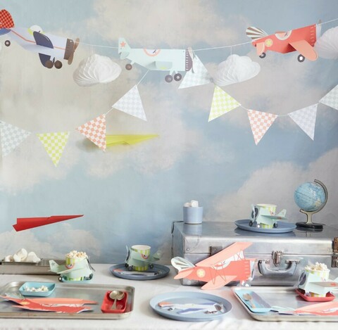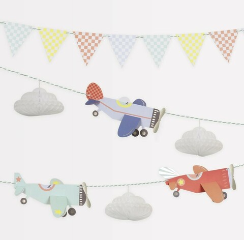 Поднимитесь в небо с этим летающим украшением. Маленькие авиаторы будут в восторге, когда увидят эту гирлянду! Крылья самолета торчат в стороны, поэтому они выглядят так, будто летят, а трехмерные облака и вымпелы с клетчатыми флагами создают великолепные эффекты. Гирлянда подойдёт не только для вечеринок, но и для великолепного украшения детской или спальни.