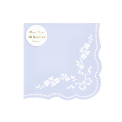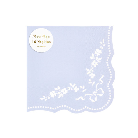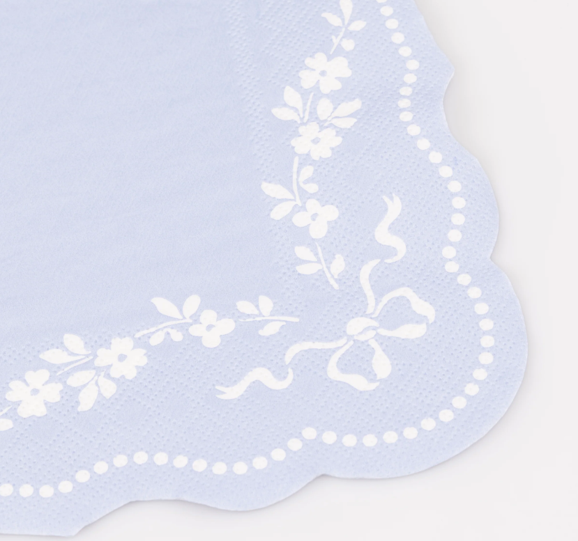 Эти большие бумажные салфетки василькового цвета, вдохновленные классической элегантностью и призванные радовать глаз, украшены белыми орнаментами в стиле рококо. Их скульптурные волнистые края отделаны изящными жемчужными акцентами, придающими им утонченную изысканность. Они идеально подойдут для обедов на свежем воздухе, чаепитий, весенних званых ужинов, детских и девичников и станут изящным завершающим штрихом на мероприятиях для взрослых.
