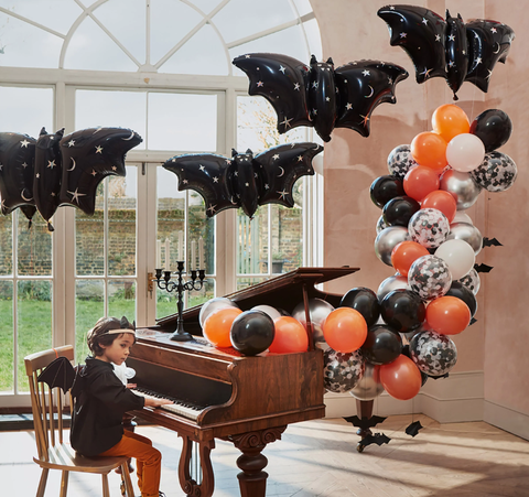 Эти блестящие воздушные шары в форме летучих мышей - отличный способ украсить комнату для вечеринки на Хэллоуин. Благодаря деталям из серебряной голографической фольги они добавят пугающий мерцающий штрих, где бы вы их не повесили.