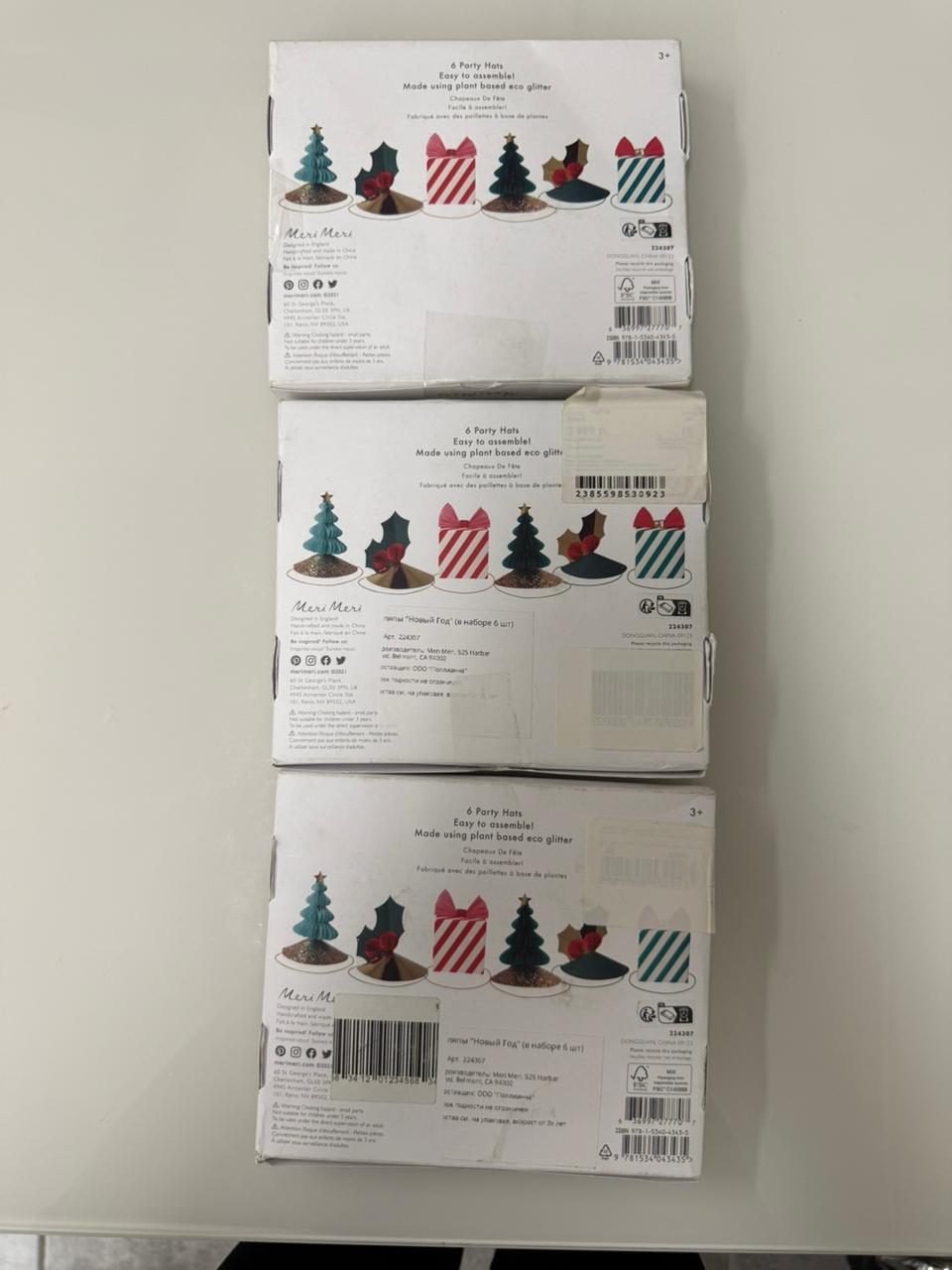 - 6 шляп разного дизайна и цвета: 2 остролиста, 2 елки и 2 подарка.