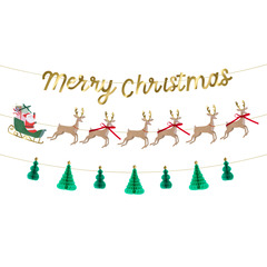- Гирлянда №1 украшена блестящими буквами из золотой фольги, из которых складывается слово «Счастливого Рождества».