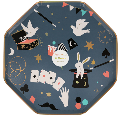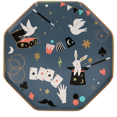 Придайте вашей вечеринке волшебный вид с этими сказочными тарелками. Они красиво исполнены в восьмиугольной форме с окантовкой из золотой фольги и изображениями магических трюков.