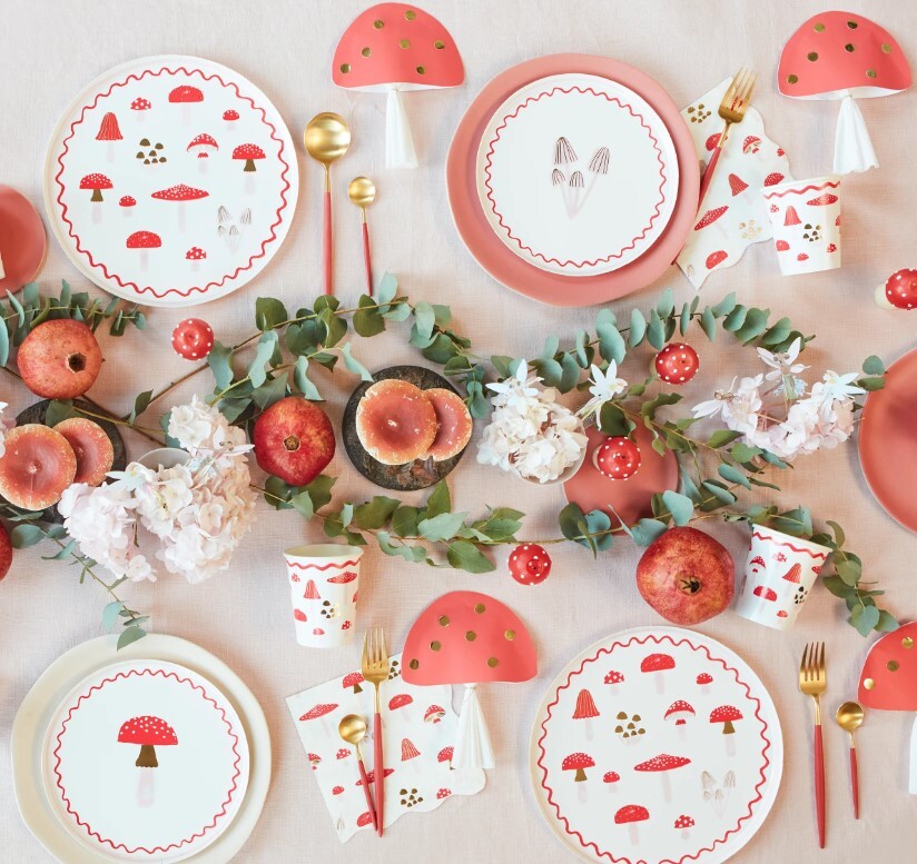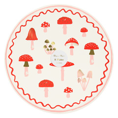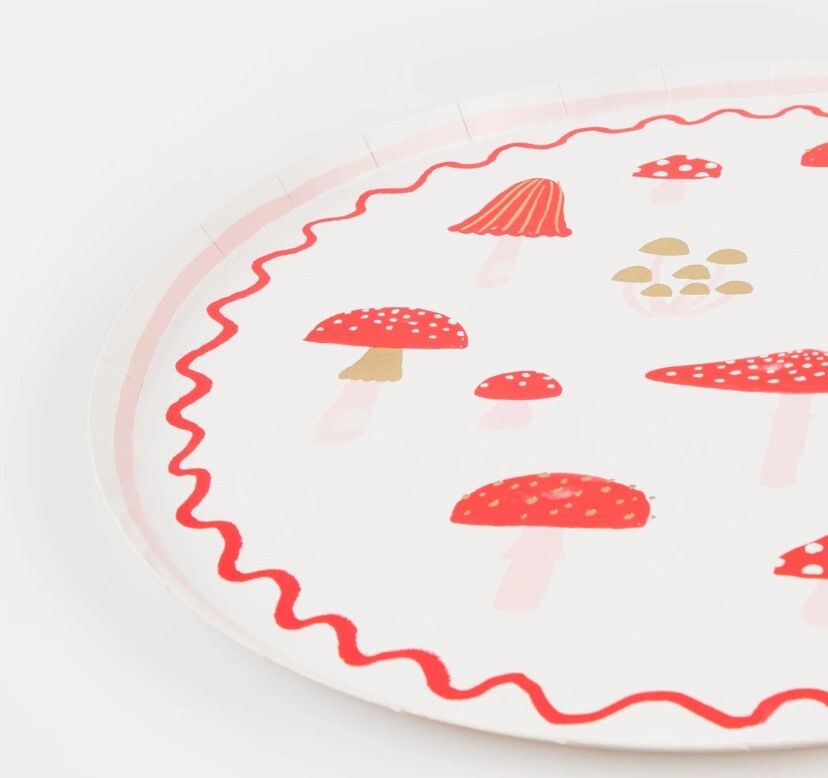 Грибы всё ещё актуальны и выглядят волшебно в качестве украшения рождественской тарелки. Их красно-белая гамма идеально вписывается в традиционную праздничную цветовую гамму, а современные акценты – стильная золотая фольга и розовый – создают дополнительный эффект. Эти большие бумажные тарелки с элегантным волнистым краем идеально подойдут для любого рождественского стола и будут ярко и красиво смотреться на праздничном столе.