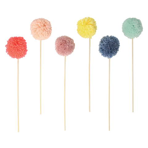 Помпоны по-прежнему являются очень модным украшением и особенно чудесно смотрятся на специальных кексах или праздничном торте. Набор состоит из 6 разноцветных помпонов на деревянных шпажках. Они идеально подходят для любой вечеринки или детского праздника.