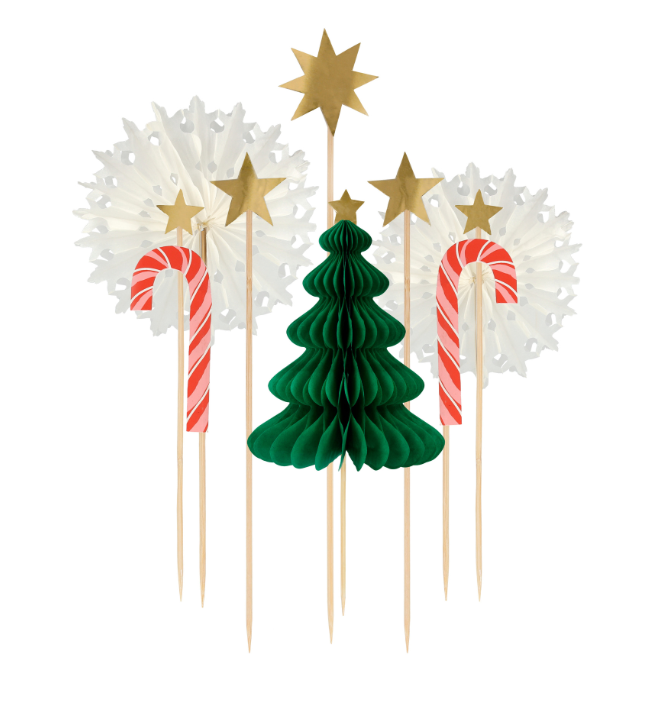 Превратите свой рождественский торт в сенсационный шедевр с помощью нашего потрясающего набора топперов для торта. Он включает в себя 3D-сотовую рождественскую елку, сотовые вертушки-снежинки, полосатые леденцы и блестящие золотые звезды с эко-блестками — триумф украшения торта!