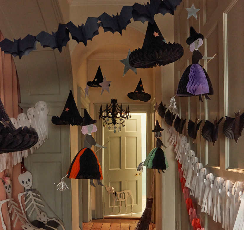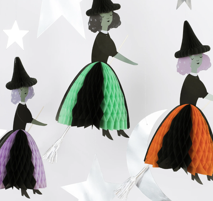 - Три летающие ведьмы в шляпах из черной папиросной бумаги в виде сот и в полосатых юбках в виде сот в черно-оранжевом, черно-мятном и черно-сиреневом цветах.