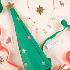 Представьте себе выражение лица ребенка, когда он разворачивает этот сказочный конус рождественской елки, покрытый креповой бумагой и наполненный подарками! Снимите слои, чтобы увидеть шляпу из золотой фольги, наклейки, временные татуировки и мелочи. Затем внутри измельченной бумаги найдите конверт, в котором лежит потрясающее эмалированное ожерелье со звездами.