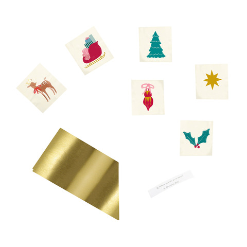 - Слои крепированной бумаги содержат праздничный колпак из золотой фольги, 4 наклейки (2 с блестящей золотой фольгой), 2 временные татуировки с блестящей золотой фольгой и 3 мелочи.